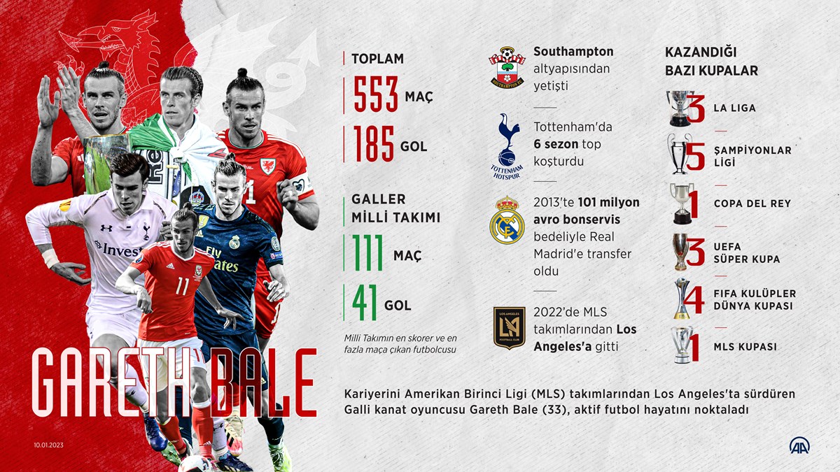Futbol dünyası bir yıldıza daha veda etti. Galli yıldız Gareth Bale, futbolu bıraktı. 33 yaşındaki Bale, Galler forması ile son olarak Dünya Kupası'nda mücadele etmişti. Kariyerine 2006'da Southampton'da başlayan Bale, 2007-2013 arasında Tottenham Hotspur formasıyla sergilediği performansın ardından Real Madrid'in yolunu tutmuştu. Bale, 2013-2022 arasında Real Madrid forması giydikten sonra ABD'ye gidip La Galaxy'ye imza atmıştı. Yıldız oyuncu kariyeri boyunca 3 La Liga, 5 Şampiyonlar Ligi, 1 Copa del Rey, 3 UEFA Süper Kupa, 3 FIFA Kulüpler Dünya Kupası ve 1 MLS Kupası kazandı.